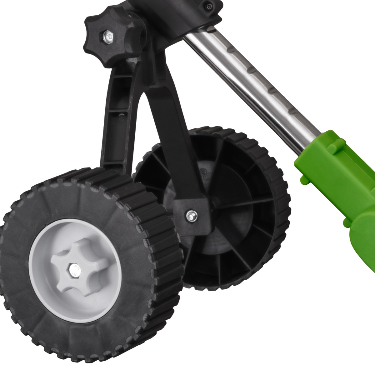 Mobilná konštrukcia na kolieskach: Umožňuje plynulý pohyb po trávniku bez potreby držať celú hmotnosť stroja – ideálne na dlhšiu prácu.
